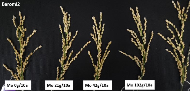 농촌진흥청 재배생리과 연구진은 몰리브덴산염이 0.1~0.2% 함유된 비료를 10아르(a)당 11kg씩 벼 이삭이 패기 25~30일 전 가루쌀(‘바로미2’)에 처리했다. 그 결과, 무처리보다 수발아율이 20~24% 감소하는 것을 확인했다.