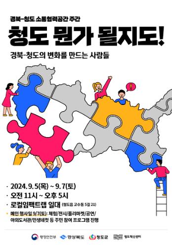 [뉴스서치] 청도군은 오는 9월 5일부터 7일까지 3일간 로컬임팩트랩(청도읍 고수동5길 21), 청도천 데크길(향군회관 앞에서한국전력공사 청도지사 구간), 청도고등학교 운동장 일원에서 '지역거점별 소통협력공간 주간 행사'를 개최한다고 밝혔다.