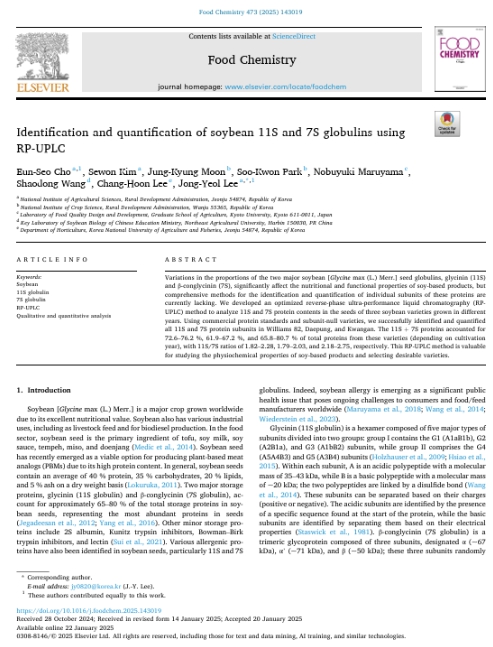 [뉴스서치] 농촌진흥청은 콩의 주요 단백질 글로불린 중 11에스(S)(글리시닌)와 7에스(S)(베타콘글리시닌)의 성분, 함량, 비율을 정밀하게 측정하는 분석법을 세계 최초로 개발했다.