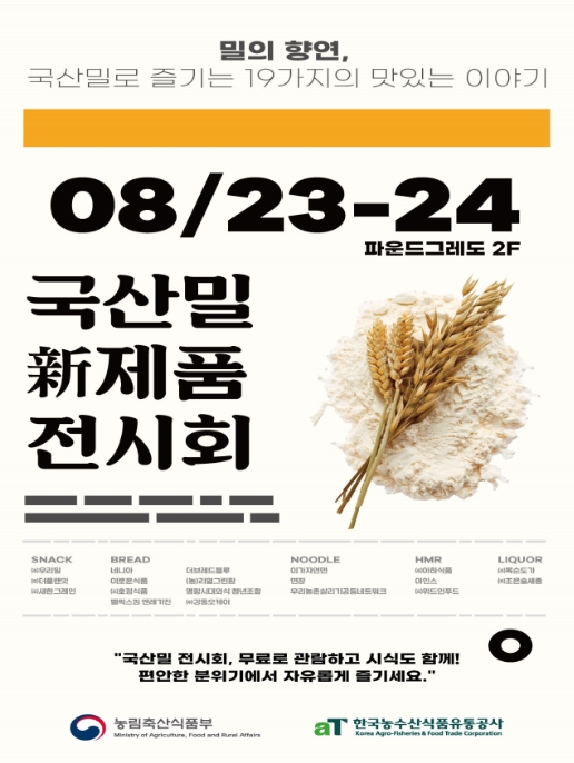 [뉴스서치] 농림축산식품부와 한국농수산식품유통공사는 8월 23일부터 24일까지 파운드그레도(서울 노원구 소재)에서 ‘밀의 향연! 국산밀로 즐기는 19가지의 맛있는 이야기, 국산밀 신제품 전시회’를 개최한다.