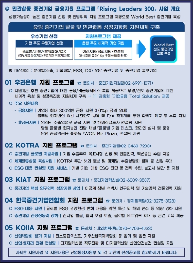2023년 우리은행과 함께 시작한 '라이징 리더스 300' 프로그램은 중견기업 맞춤형 금융지원 확대와 경쟁력 강화를 목적으로 ▴수출, ▴기술개발, ▴환경․사회․지배구조(ESG) 대응, ▴디지털 전환에 필요한 우대금융을 제공하고 있으며, 금년에는 지원 대상 중견기업 수와 지원 규모를 확대하여 최대 80개 중견기업 대상 1조원 내외 우대금융 등을 지원할 계획이다.