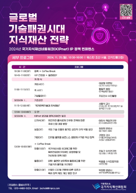 [뉴스서치] 대통령소속 국가지식재산위원회는 11월 25일, ‘글로벌 기술패권시대 지식재산 전략’을 주제로 '2024년 국가지식재산네트워크(‘KIPnet’) IP 정책 컨퍼런스'를 웨스틴 조선 서울 호텔에서 개최했다.