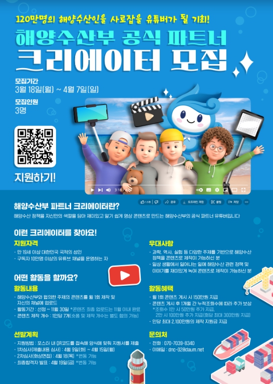 모집 대상은 만 19세 이상 대한민국 국적을 가진 성인 중 유튜브에서 개인 채널을 운영 중이며, 구독자가 10만 명 이상인 자로, 해양수산부 공식 유튜브에 게시된 모집글의 안내에 따라 신청하면 된다.