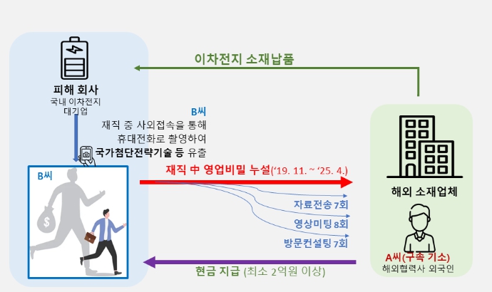 B씨는 이차전지 소재개발업무와 관련된 자료를 자택 등에서 휴대전화 등을 이용하여 촬영하는 방식으로 유출했으며, 유출자료는 피해회사의『전고체전지』개발정보, 제품개발 및 단가 로드맵 등 개발 및 경영에 관한 전략정보, 음극재 개발정보(성능 평가, 해외협력사 운영방안 등)이며, 이 중『전고체전지』를 포함한 일부 기술들은 국가산업경쟁력에 직접적인 영향을 미치는 국가첨단전략기술에 해당된다.