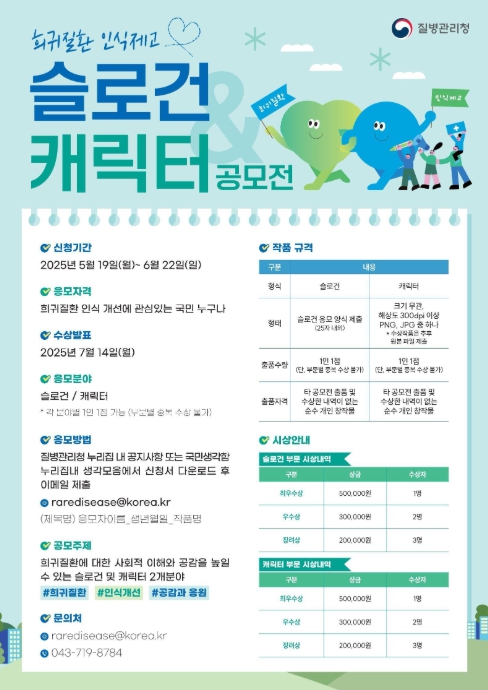 [뉴스서치] 질병관리청은 희귀질환에 대한 사회적 관심을 높이고 공감대를 확산하기 위해 '2025년 희귀질환 인식 제고 슬로건·캐릭터 공모전'을 5월 19일부터 6월22일까지 약 한 달간 개최한다.