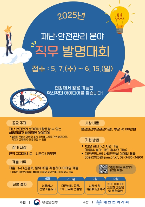 [뉴스서치] 행정안전부는 지자체 공무원을 대상으로 5월 7일부터 6월 15일까지 ‘2025년 재난·안전관리 분야 직무 발명대회’를 개최한다.