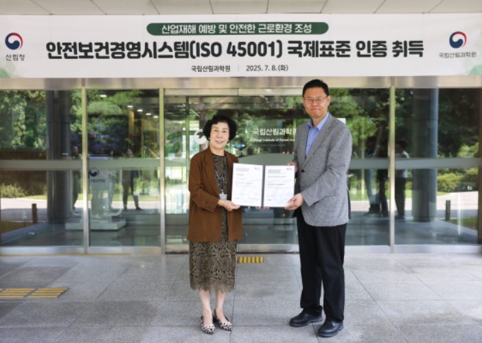 국립산림과학원이 취득한 ISO 45001은 국제표준화기구(ISO)가 제정한 안전보건경영시스템 국제표준으로, 연구자의 안전과 건강을 보호하기 위한 체계적인 경영시스템 구축 여부를 검증하는 제도다.
