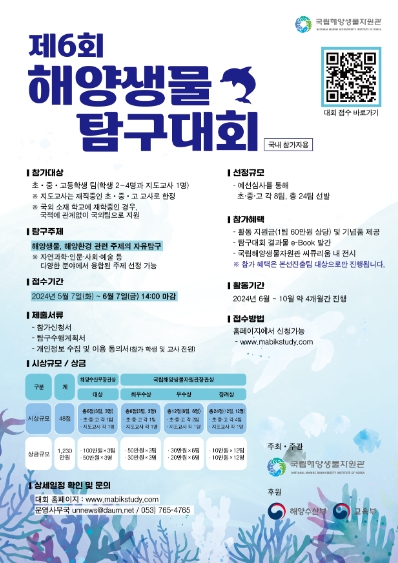 [뉴스서치] 청소년들에게 무궁무진한 가능성을 품은 ‘바다’를 과학적으로 탐색할 수 있는 기회를 제공하는 ‘제6회 해양생물 탐구대회’가 열린다. 이 대회는 해양수산부가 후원하고 국립해양생물자원관이 주최하며, 5월 7일부터 6월 7일까지 온라인으로 참가 접수를 받는다.