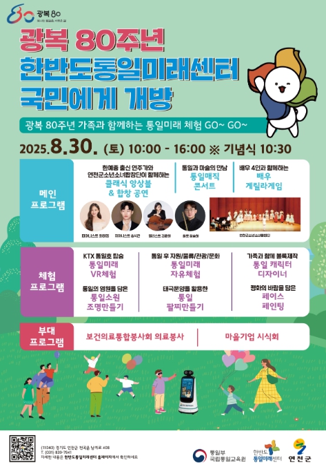 고영환 국립통일교육원장은 “이번 행사는 광복 80주년, 분단 80년의 의미를 되새기며 국민들과 함께 한반도 평화를 염원하는 뜻깊은 자리가 될 것으로 기대한다”면서, “앞으로 우리 청소년들이 한반도 평화와 통일을 꿈꾸고, 함께 이루어 갈 수 있도록 통일교육을 평화·통일·민주시민교육으로 확장하겠다”고 밝혔다.