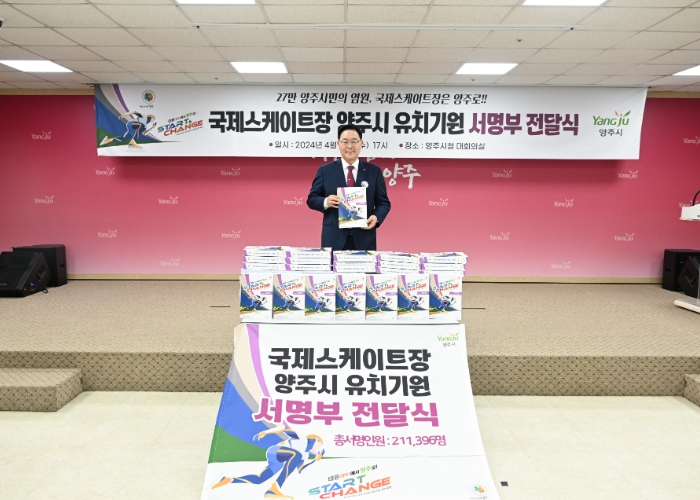 [뉴스서치] 강수현 양주시장이 지난 24일 시청 대회의실에서 ‘국제스케이트장 유치’를 기원하는 시민 서명부를 직접 전달받고 “유치 성공을 위한 우리 시의 열망을 오늘 충분히 보여줬다”며 하나의 목표를 향한 강한 의지를 밝혔다.
