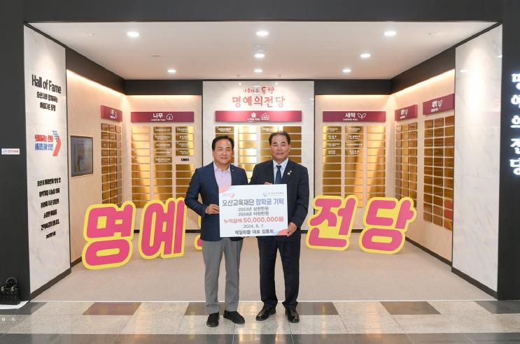 제일화물운송공사 김동희 대표는 상이군경회 오산시지회장으로 활동하며 안보의식 강화와 국가발전을 위한 보훈 활동뿐만 아니라 취약계층 지원 및 사회봉사 등 그간 다양한 사회 공헌 활동을 통해 지역사회 발전에 기여해 왔으며, 지난해 5월 명예의 전당 특기장학금으로 3천만 원을 기탁하여 이번 기부로 누적 기탁액이 5천만 원이 되었다.