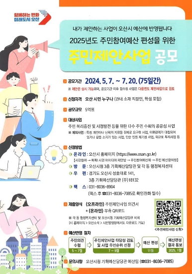 [뉴스서치] 오산시는 오는 7월 20일까지 2025년 예산에 반영할 주민참여예산 제안사업 집중 공모를 실시한다고 밝혔다.