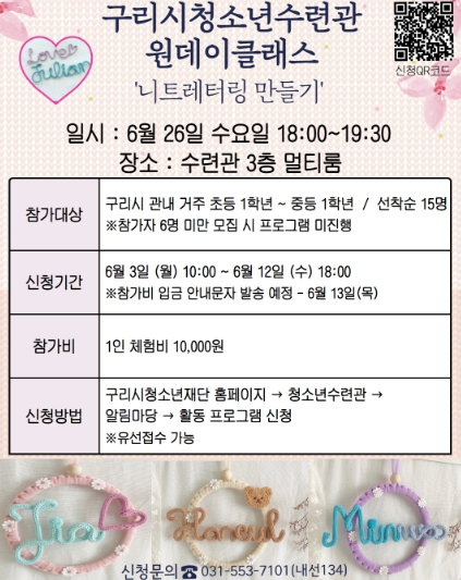 [뉴스서치] 구리시청소년재단 청소년수련관은 환경보호 활동의 일환으로, 오는 6월 22일 빛소어린이작은도서관과 6월 26일 수련관 3층 멀티룸에서 니트와 실 등을 활용한 ‘니트레터링 만들기’ 프로그램을 운영한다.