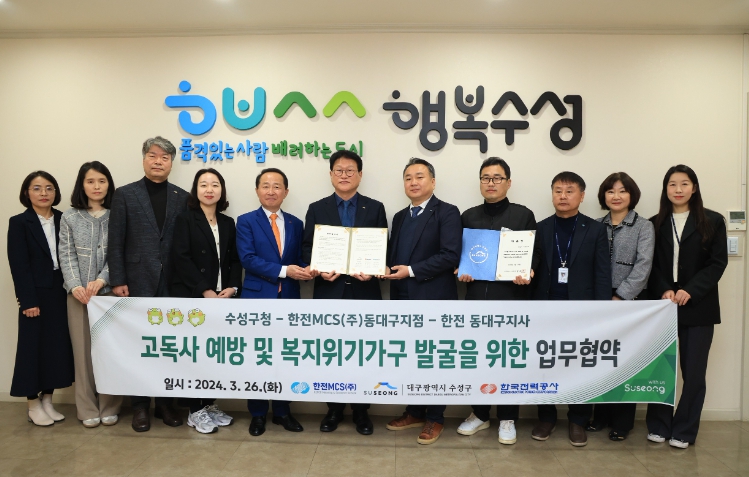 [뉴스서치] 대구 수성구는 지난 26일 한전MCS(주) 동대구지점, 한국전력공사 동대구지사와 복지위기가구 발굴・지원 및 고독사 예방을 위한 업무협약을 체결했다.