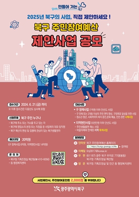 문인 북구청장은 “이번 주민 제안사업 공모에 주민 여러분의 많은 관심과 참여를 부탁드린다”며 “앞으로도 참여예산을 적극 활용해 주민들의 소중한 지혜를 모으고 지방재정을 발전시켜 나가겠다”고 말했다.