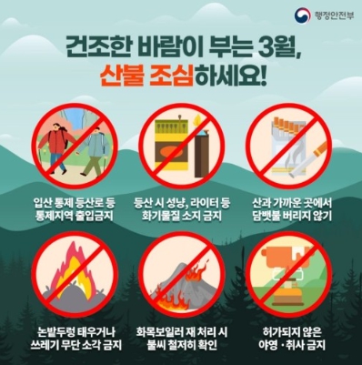 산불예방 안전수칙으로는 ▲쓰레기 및 농작물 소각 금지 ▲지정된 장소에서 흡연 ▲등산 시 인화물질 소지 금지 ▲무분별한 취사행위 금지 등이 있다