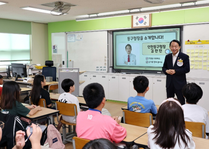 ▲ 김찬진 인천 동구청장, 창영초서 ‘행복한 동구 만들기’ 수업 진행 |