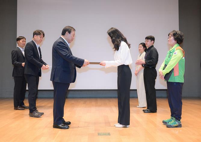 최민호 시장은 2일 시청 4층 여민실에서 열린 ‘6월 직원소통의 날’ 행사에서 1등 청렴인으로 선정된 서민아 연구사에게 포상을 수여했다.