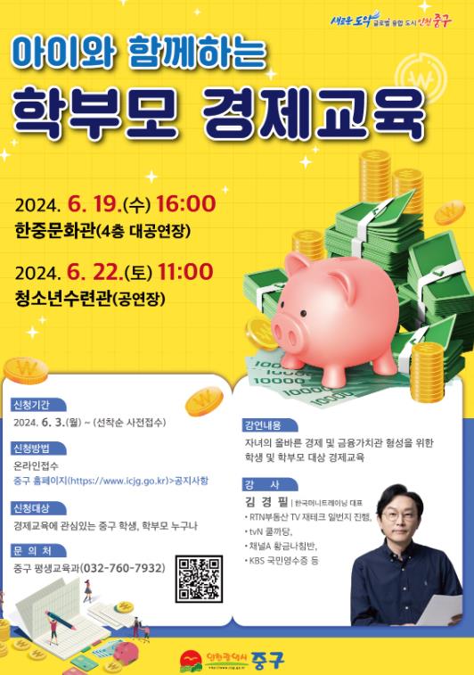 [뉴스서치] 인천시 중구는 오는 6월 19일, 22일에 경제 전문가 김경필 강사를 초청해 ‘아이와 함께하는 학부모 경제교육’을 개최한다.