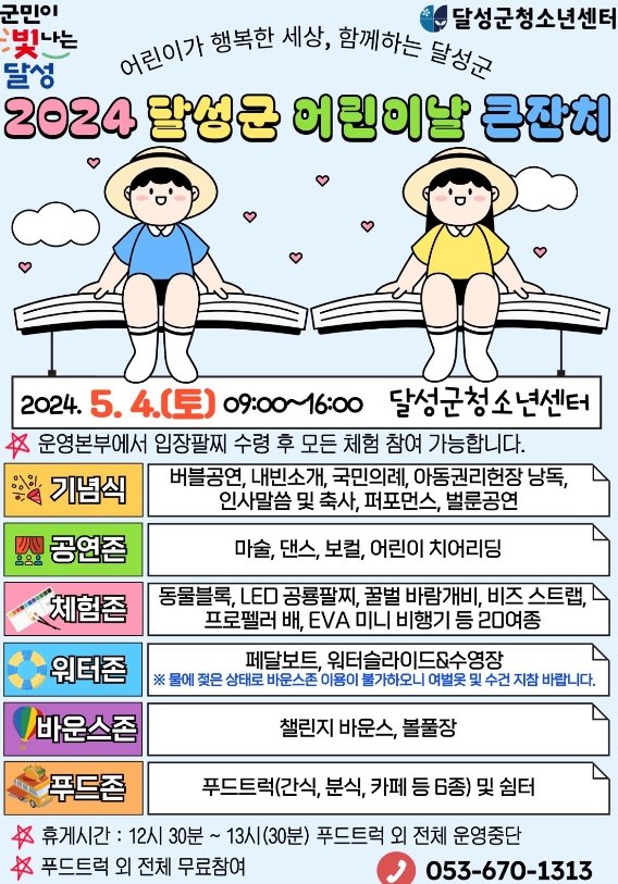 누구나 참여 가능한 ‘2024년 달성군 어린이날 큰잔치’는 푸드존을 제외한 모든 것에 무료로 참여 가능하며, 군은 이날이 행사명에 걸맞은 어린이들을 위한 큰잔치가 될 수 있도록 행사 막바지 준비에 힘쓰고 있다.