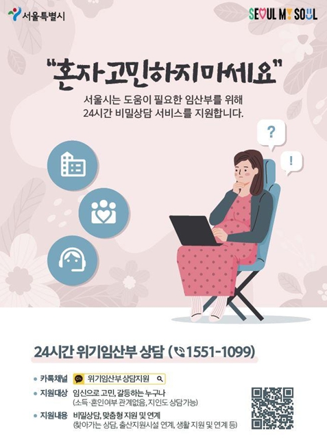임신으로 고민·갈등하는 위기임산부라면 누구나 전화나 SNS(카톡채널 ‘위기임산부 상담지원’)를 통해 24시간 전용 비밀상담을 받을 수 있다. ‘서울시 위기임산부 통합지원센터’는 위기임신보호출산법 시행에 따른 지역상담기관(전국 16개소) 역할도 겸하고 있다. 전국의 위기임산부는 지역과 상관없이 전국 대표번호로 전화하면 가까운 지역상담기관과 연결돼 비밀상담을 받을 수 있다.