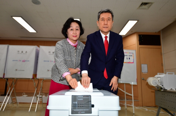 ▲ 이강덕 포항시장이 5일 오전 포항시의회에 마련된 대이동 사전투표소에서 배우자 최혜련 여사와 함께 투표를 하고 있다. |