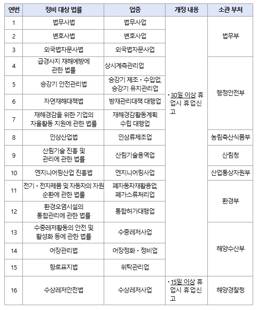 또한 산림기술용역업자도 휴업신고를 하지 않으면 등록이 말소되거나 100만원 이하의 과태료 부과 대상이었지만, 앞으로는 30일 미만으로 휴업하는 경우에는 신고를 하지 않아도 된다('산림기술 진흥 및 관리에 관한 법률').