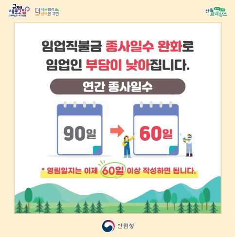 [뉴스서치] 산림청은 올해부터 임업직불금 신청자격 중 산림경영 종사일 수 기준을 기존 90일에서 60일 이상으로 완화했다고 17일 밝혔다.