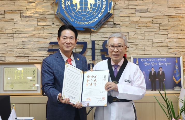 ▲ 이동섭 국기원장(왼쪽)이 김창준 前 미국 연방하원의원(오른쪽)에게 명예 7단증을 수여하고 기념사진을 촬영하는 모습 |