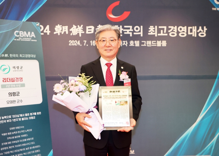 [뉴스서치] 경남 의령군은 16일 서울 더플라자호텔에서 개최한 ‘2024 한국의 최고경영대상’ 시상식에서 '리더십경영' 부문 대상을 수상했다.