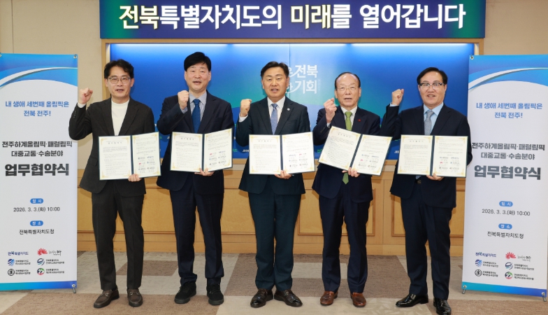 [뉴스서치] 전북특별자치도는 3일 도청 회의실에서 전주하계올림픽·패럴림픽 유치를 위한 대중교통·수송 분야 업무협약을 체결하고, 안전하고 체계적인 수송 지원 기반 마련에 본격 나섰다.