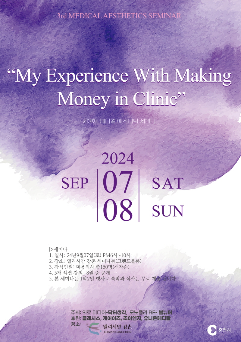 먼저 '3rd MEDICAL AESTHETICS SEMINAR’는 'My Experience With Making Money in Clinic’을 주제로 열리며, 9월 7일(토) 오후 6시부터 10시까지 엘리시안 강촌 세미나룸 그랜드볼룸에서 미용의사 총 150명이 참석할 예정이다.