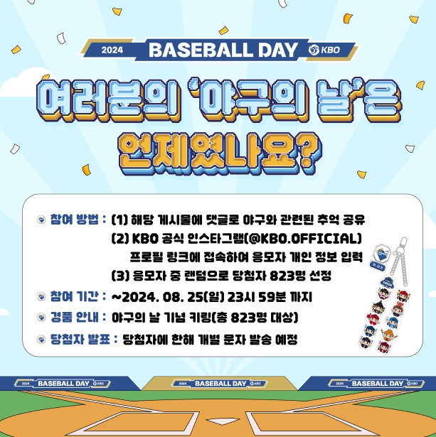 8월 21일(수)부터 KBO 공식 인스타그램 채널에서는 야구 팬들의 소중한 ‘야구의 날’에 대한 추억을 서로 공유할 수 있는 '여러분의 ‘야구의 날’은 언제인가요?' 이벤트를 진행하며, 추첨을 통해 총 823명의 당첨자를 선정하여 야구의 날 기념 키링을 증정할 예정이다.