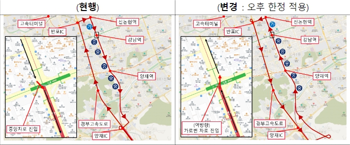② (강남대로 중앙차로 운행 분산) 강남대로 중앙버스전용차로의 정체를 완화하기 위해 15개 노선을 일부 구간에서 가로변 차로로 조정한다.