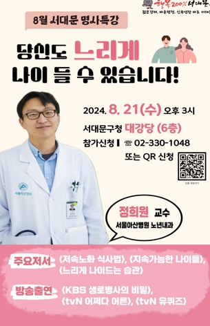 [뉴스서치] 서대문구가 이달 21일 오후 3시 구청 6층 대강당에서 서울아산병원 노년내과 정희원 교수를 초청해 ‘당신도 느리게 나이들 수 있습니다’란 주제로 8월 서대문 명사특강을 개최한다.