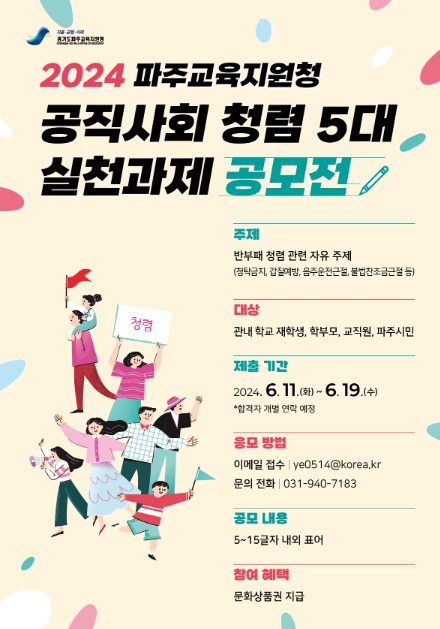 [뉴스서치] 경기도파주교육지원청은 우리 사회의 청렴 문화에 대한 관심을 높이고, 직접 참여하는 청렴 문화 조성을 위하여 파주교육지원청 관내 학생, 학부모, 교직원, 파주시민을 대상으로 『공직사회 청렴 5대 실천과제 표어 공모전』을 실시한다고 밝혔다.