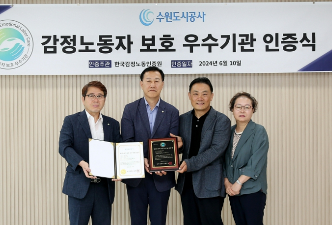 [뉴스서치] 수원도시공사는 10일 한국감정노동인증원으로부터 ‘감정노동자 보호 우수기관’으로 인증 받았다고 밝혔다.