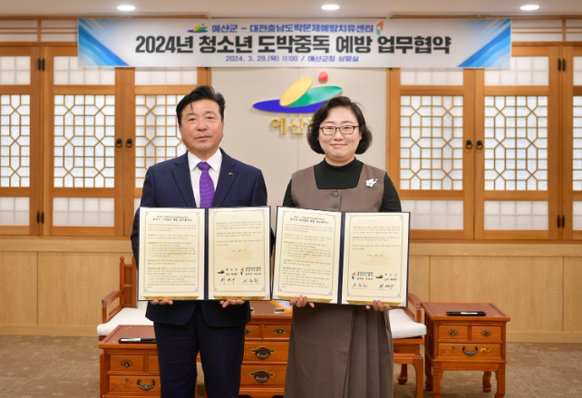 [뉴스서치] 예산군은 지난 28일 군청 상황실에서 대전충남도박문제예방치유센터와 관내 청소년 도박중독 예방을 위한 업무협약을 체결했다.
