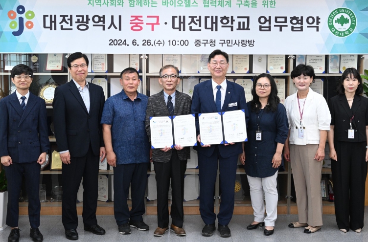 [뉴스서치] 대전 중구는 26일 대전대학교 바이오헬스 혁신융합대학 사업단과 바이오헬스 지산학 협력 체계 구축을 위한 업무협약(MOU)을 체결했다고 밝혔다.