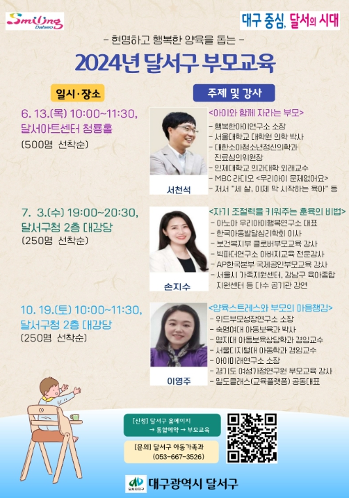 [뉴스서치] 대구 달서구가 6월 13일부터 총 3회 올바른 부모상 정립과 행복한 양육방법을 안내하는'2024년 부모교육'을 추진한다.