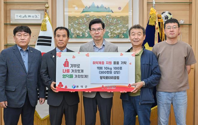 이날 기탁한 쌀은 지난 6월 21일 영덕로타리클럽 회장 이 · 취임식에서 축하 화환을 대신해 받은 것으로, 영덕군은 전달받은 쌀을 관내 복지 사각지대 주민들에게 전달할 예정이다.