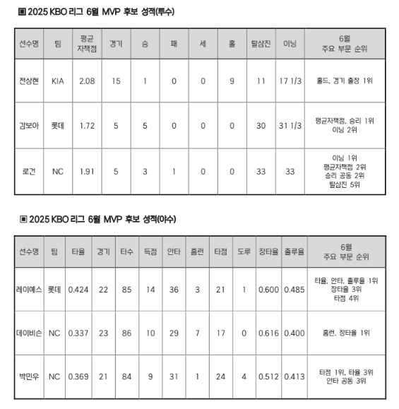▲ 2025 신한 SOL뱅크 KBO 리그 6월 월간 MVP 후보 성적 |