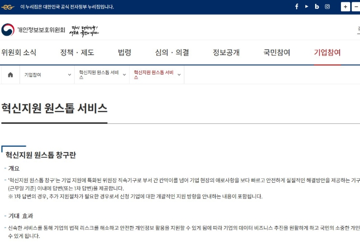 ▲ 개인정보위 홈페이지 혁신지원 원스톱 서비스 안내창 |