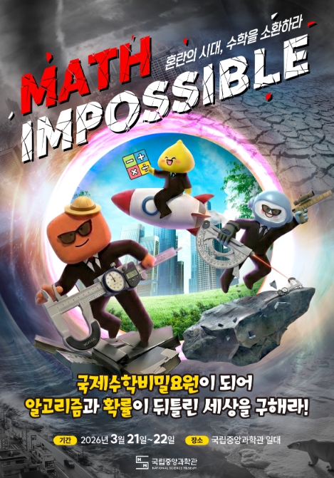 [뉴스서치] 과학기술정보통신부 국립중앙과학관은 3월 21일부터 22일까지 양일간, 관람객이 주인공이 되어 수학적 사고로 위기를 극복하는 임무형(미션형) 수학 행사 ‘Math Impossible: 혼란의 시대, 수학을 소환하라!’를 개최한다.