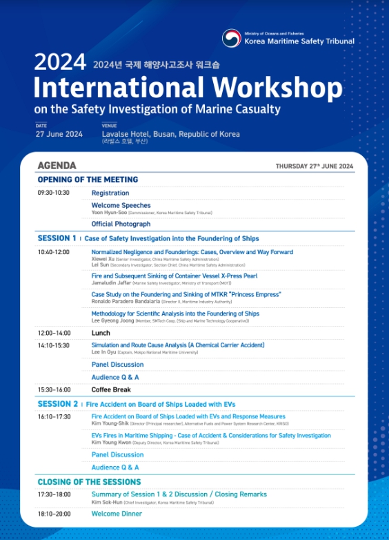 올해 토론회에서는 “선박 침몰사고의 사례와 과학적 분석”과 “선박 내 전기차화재의 특성과 사고조사” 등 총 2개의 주제가 논의된다. 첫 번째 세션에서는 중국, 싱가포르, 필리핀의 해양사고조사 전문가와 국내 전문가들을 초청해 선박 침몰사고 조사사례를 소개하고 그 원인규명을 위해 활용된 다양한 기법들을 논의할 예정이다.