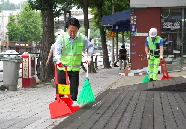 ▲ 민선 8기 후반기 첫행보로 새벽 거리 청소 나선 이성헌 서대문구청장 |