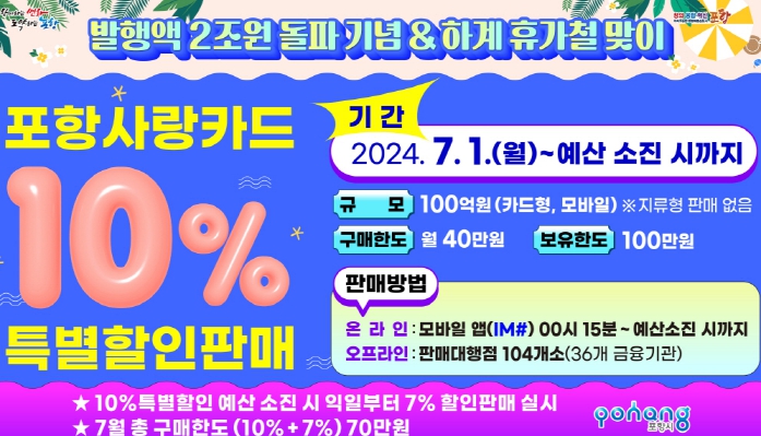 [뉴스서치] 포항시가 내달 1일부터 포항사랑상품권 누적 발행액 2조 원 돌파를 기념해 포항사랑카드와 모바일 포항사랑상품권 100억 원을 10% 특별할인 판매한다.