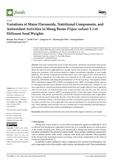 연구진은 한국, 중국, 인도에서 수집한 136개의 녹두 유전자원을 무게에 따라 구분하고 플라보노이드(비텍신, 이소비텍신) 등 주요 유용성분, 항산화 활성 등을 정밀 분석했다.