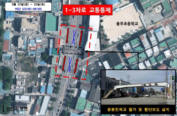 ▲ 용봉천육교 공사구간 교통통제(3월22일 금요일 야간). |