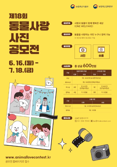 이번 사진 공모전은 ‘사람과 동물이 함께 행복한 세상(One Welfare)’을 주제로 실시되며, 2024년 1월 1일 이후 본인이 직접 촬영한 작품을 응모할 수 있다. 응모 분야는 일반 카메라 사진, 스마트폰 사진, 짧은 영상(숏폼)으로 구성되며, 6월 16일부터 7월 18일까지 동물을 사랑하는 국민 누구나 공모전 누리집을 통해 참여할 수 있다.